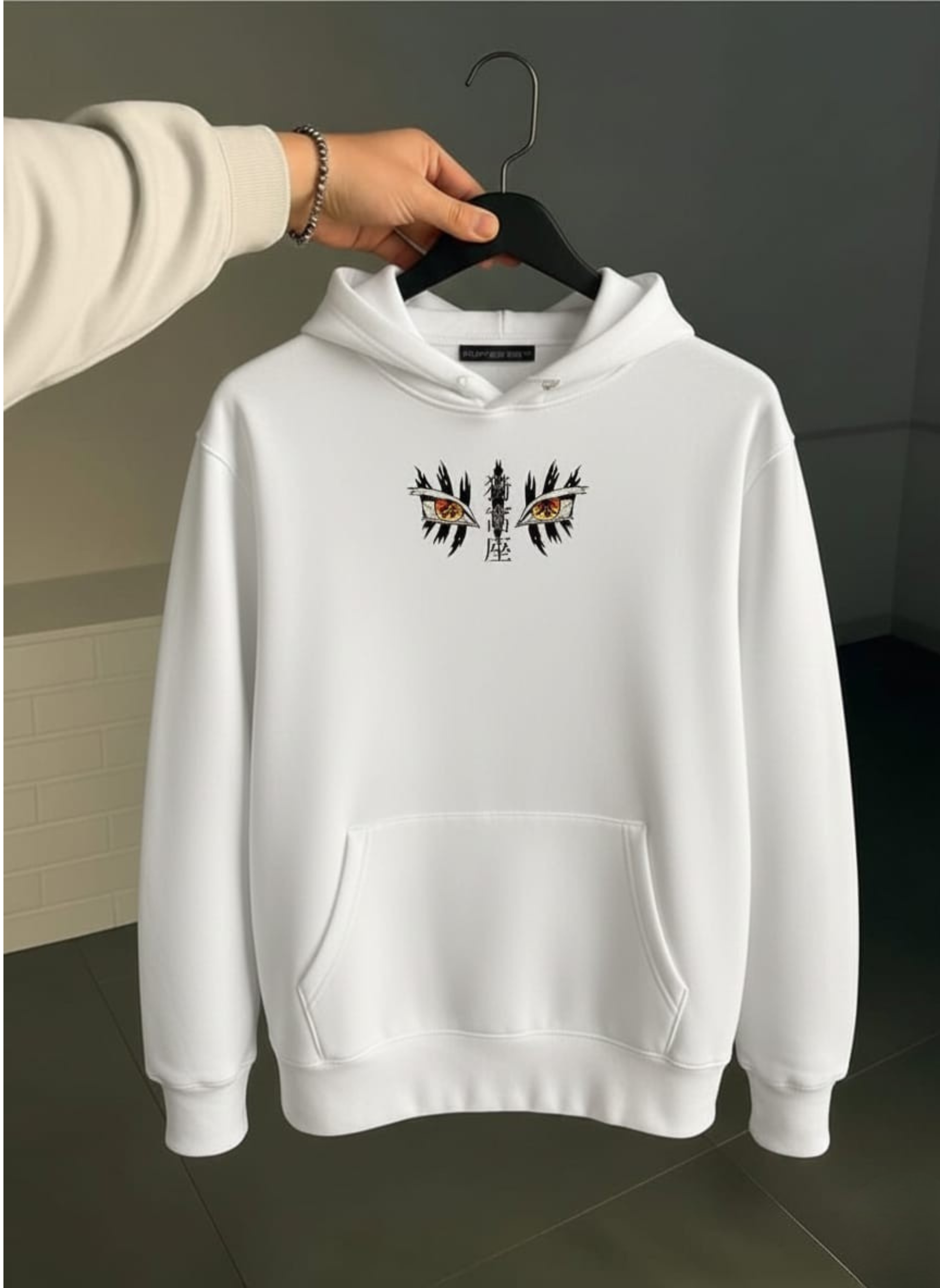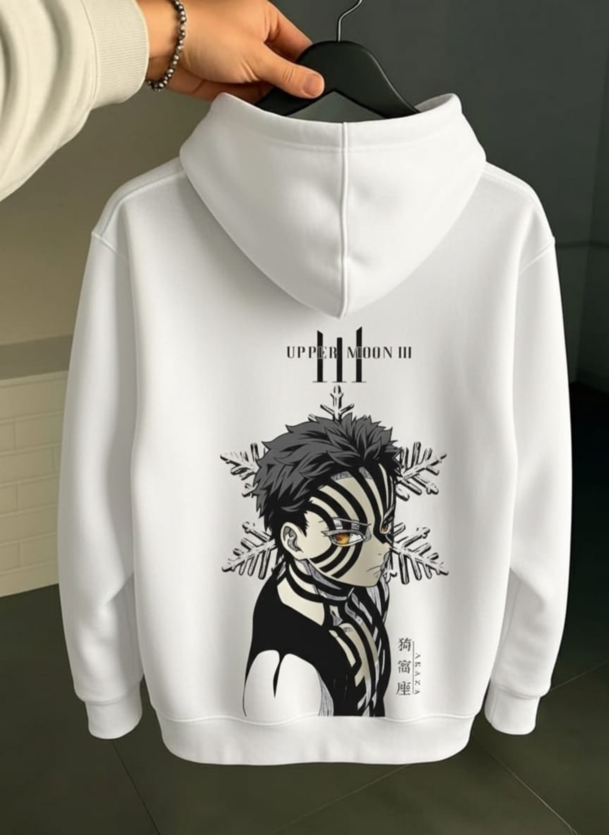 - This premium white hoodie features a detailed manga-style portrait of Akaza from Demon Slayer.
